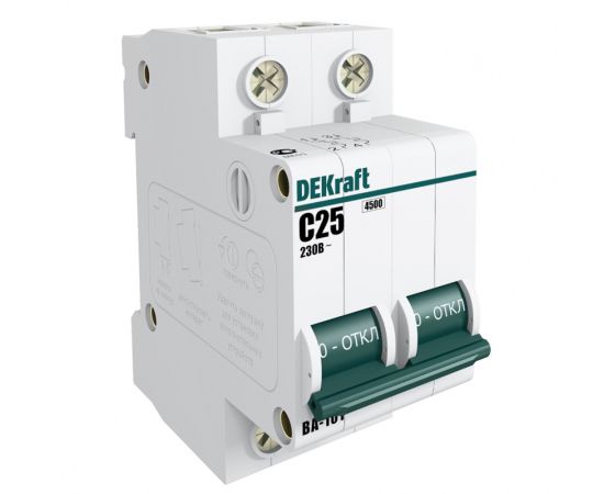 Автоматический выключатель серии ВА-101 DEKraft, 2P, номинальный ток 25 А, характеристика С, отключающая способность 4,5 кА. Новый механизм расцепления мгновенно разрывает цепь при возникновении аварии. 5 монолитных заклепок повышают прочность корпуса аппарата. Сплошная лицевая панель обеспечивает безопасность эксплуатации аппарата. Боковые каналы охлаждения повышают стабильность работы при высоких температурах окружающей среды. Полностью автоматизированный контроль качества производства.