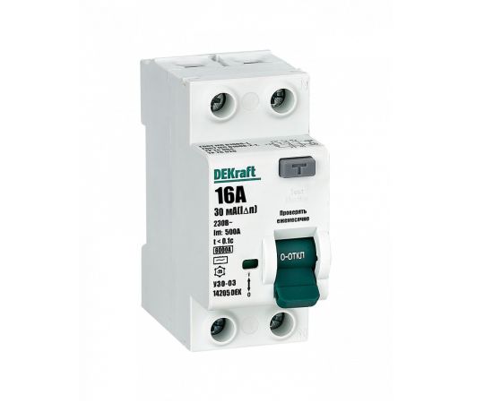 Выключатель дифференциального тока серии УЗО-03 DEKraft; 2P; номинальный ток 16 А; ном.дифф. ток 30 мА; электромеханический; тип дифференциального расцепителя - AC; на DIN-рейку. ВДТ устанавливаются в сетях напряжением до 400 В пер.тока. ВДТ применяются для защиты электроустановок от риска возникновения пожаров вследствие утечек тока. Конструкция устройств позволяет эксплуатировать их даже при низкой температуре. При сборке выключатель дифференциального тока (ВДТ) и автоматический выключатель (для защиты ВДТ) устанавливаются последовательно, при этом номинальный ток аппарата должен быть на одну ступень выше - т. е. 20А при установке последовательно с автоматом на 16А, 32А при установке с автоматом на 25А.