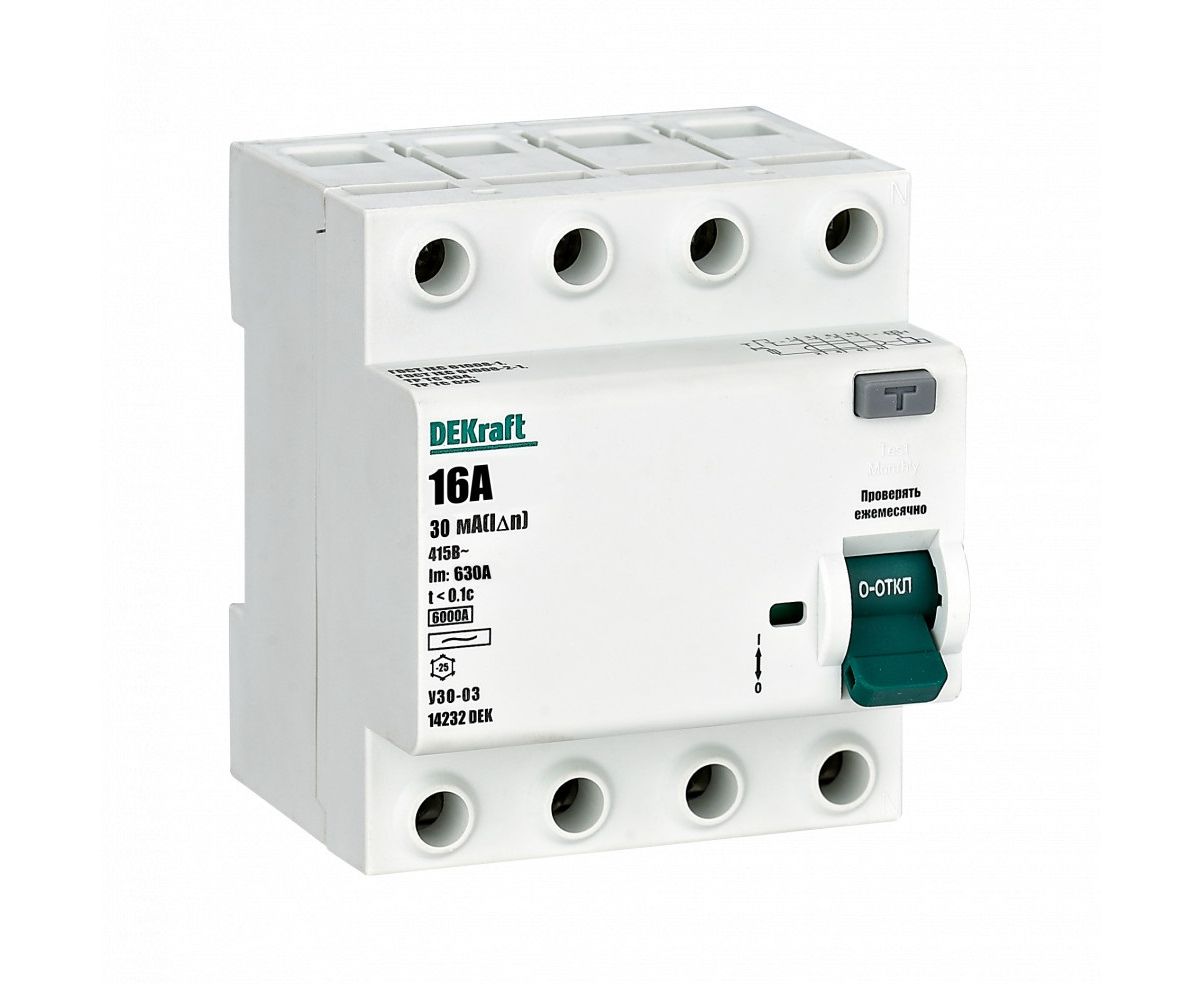 Модульное устройство защитного отключения из серии оборудования УЗО-03 торговой компании DEKraft Schneider Electric представляет собой выключатель дифференциального тока с 4-мя полюсами, который гарантирует защиту человека от поражения электрическим током при прямом прикосновении. Он обладает чувствительностью 30 мАмпер и срабатывает мгновенно при превышении тока утечки номинала. Аппарат относится к устройствам типа AС и реагирует на чистый синусоидальный ток. Рассчитан на номинальную нагрузку 16 Ампер при напряжении сети 415 Вольт переменного тока. Его отключающая способность составляет 6 кАмпер. Крепление производится на DIN-рейку, подключение допустимо проводниками с сечением 25 кв мм. Тип устройства – электромагнитный. Это надежная категория устройств защиты, которая может эксплуатироваться при низких температурах окружающей среды до -25 градусов Цельсия. Также ВДТ защищает цепь даже при обрыве нулевого или фазного проводника. На корпусе устройства присутствует двухпозиционный рычаг управления (I/O). Тест