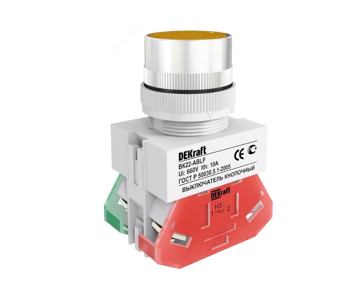 Выключатель кнопочный серии ВК-22 DEKraft, с потайным толкателем, желтый, без индикации, ном.ток 10 А, установка - на панели или двери, степень защиты - IP54, подключение - винтовыми зажимами. Выключатели кнопочные ВК-22 предназначены для коммутации электрических цепей и индикации состояния электрических цепей. Применяются в сетях переменного тока частотой 50/60 Гц с напряжением до 660В. Могут устанавливаться на подвижных и неподвижных частях стационарных установок.