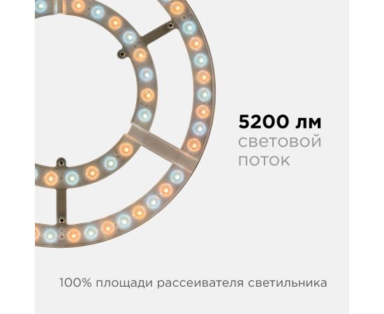 Светодиодный модуль со встроенным драйвером с артикулом 02-69 предназначен для замены стандартных ламп, а также современных светодиодных источников свечения, которые уже повсеместно используются в настенно-потолочных светильниках. Благодаря конструкции этого модуля плафон светильника будет светиться на все 100%, а уровень освещенности повысится даже по сравнению со светодиодными лампами аналогичной мощности. Благодаря большей площади охлаждения срок службы будет в разы больше. У данного изделия световой поток равен 5200 Лм, что является эквивалентом 5-ти ламп накаливания мощностью по 110 Вт каждая. Является двухцветным. Каждый светодиод изделия имеет 2 базовых цвета: теплый белый с цветовой температурой 3000 К и холодный белый с цветовой температурой 6500 К. Благодаря такой модификации можно получить любой оттенок свечения белого цвета по желанию: от холодного белого до теплого белого, включая такой промежуточный цвет свечения, как дневной белый с цветовой температурой 4000 К. Управление цветом происходит с п