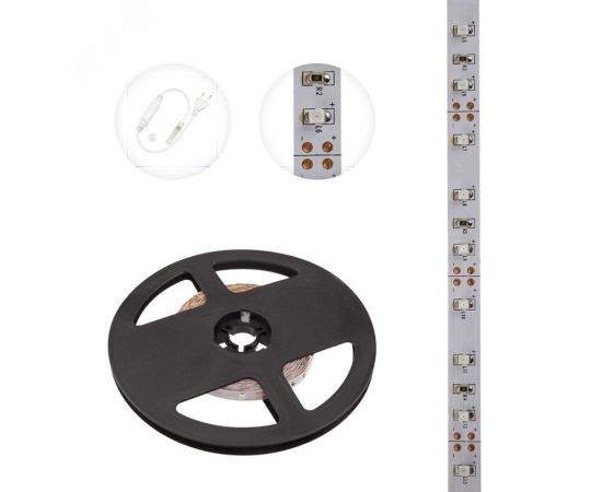 Светодиодная лента — гибкая лента на самоклеящейся основе, на которой установлены светодиоды. Может использоваться в подсветке интерьеров, изготовлении световых рекламных конструкций и пр. Работает от напряжения 12 В, поэтому при подключении к обычной бытовой сети 220 В потребуется источник питания 12 В. Поставляется в катушках длиной 5 м. Монтаж ленты осуществляется вручную с помощью дополнительных аксессуаров (профиль, коннекторы, диммеры) и не требует специальной квалификации. Для более надежной фиксации ленты к поверхности можно использовать крепеж арт. 07-4207.