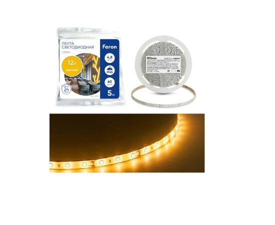 Cветодиодная LED лента FERON 60SMD(3528)/м, 4.8 Вт/м, 5м, IP65, 12V, желтый LS604 27674 служит для наружного монтажа и декоративной подсветки зданий. Изделие работает от сети 230В через адаптер, преобразующий напряжение в 12 В. Такое подключение отличается высокой степенью безопасности и надежности.