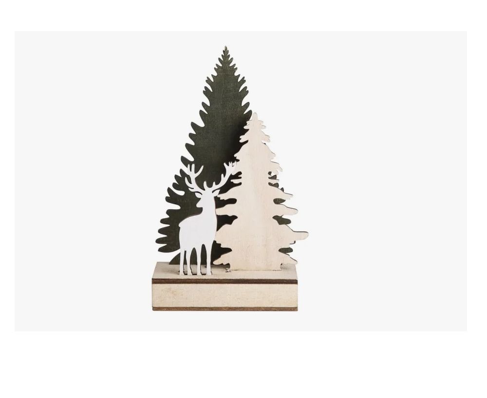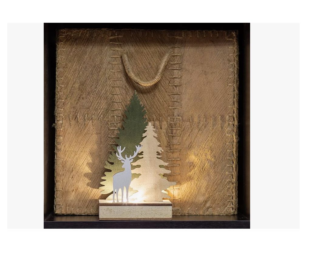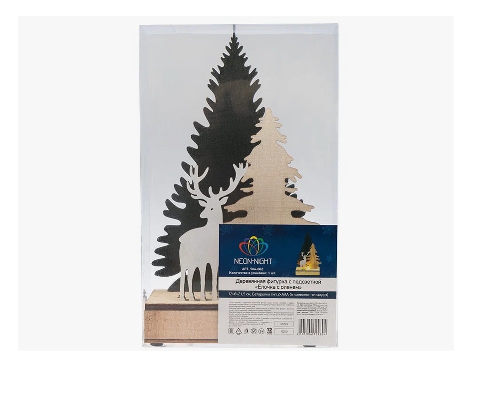 «Елочка с оленем» (артикул 504-002) — деревянная фигурка с подсветкой для украшения интерьера. П редставляет собой композицию из трёх фигур: двух резных елей и оленя; изготовлена из листовой древесины с характерной фактурой; 3 безопасных светодиода излучают тёплый белый свет и не нагревают основу; питание осуществляется при помощи 2 батареек типа ААА (батарейки не в комплекте).