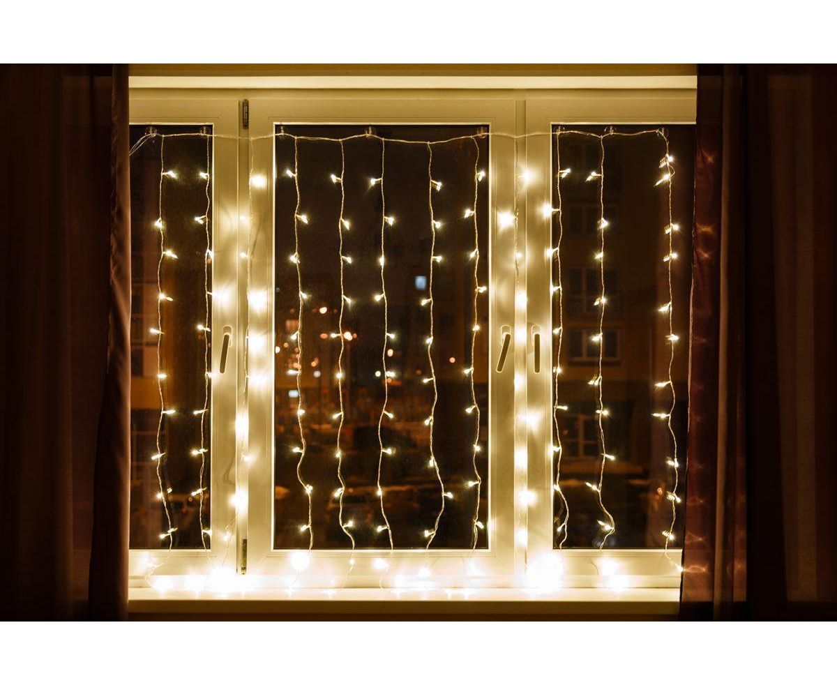 Светодиодный занавес A-039 WT с эффектом «водопад», размерами 1,5×2,8 м (10×56) и влагозащищённым прозрачным проводом.