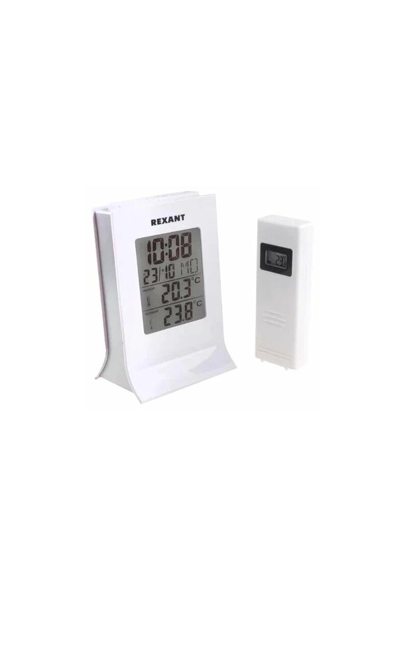 Метеостанция REXANT 70-0595 с беспроводным выносным датчиком предназначена для измерения температуры внутри и снаружи помещения одновременно.
