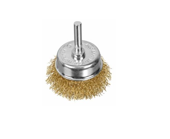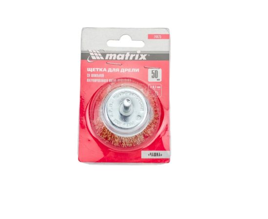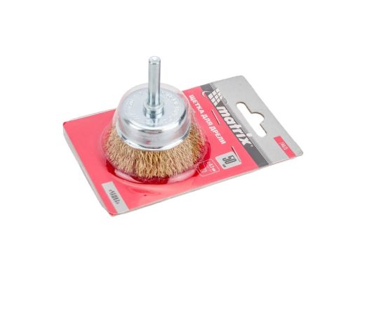 Щетка для дрели «чашка» Matrix 74475 диаметром 50 мм, со шпилькой, с щетиной из латунированной витой проволоки, используется для очистки металлических, деревянных и пластиковых поверхностей от незначительных загрязнений и остатков лакокрасочных покрытий. Помогает подчеркнуть структуру материала или придать ему шероховатость. Форма чашки позволяет обрабатывать плоские участки большой площади. Хвостовик диаметром 6 мм устанавливается в патрон электродрели, поддерживающей скорость 4500 об/мин. Во время работы нужно использовать средства индивидуальной защиты — респиратор, очки, наушники, спецодежду и обувь.