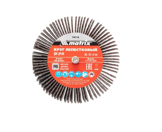 Лепестковый круг для дрели Matrix 74114, 60 х 20 х 6 мм, с зернистостью P 80, используется совместно с дрелями и прямыми шлифовальными машинами с посадочным диаметром 6 мм и максимальной скоростью вращения 8000 об/мин. Оснастка предназначена для радиального шлифования внутренних и наружных поверхностей. Абразив P 80 позволяет проводить промежуточную обработку древесины и металла - удалять заусенцы, слои лака, ржавчины или краски, зачищать сварные швы, готовить поверхности к чистовому шлифованию.