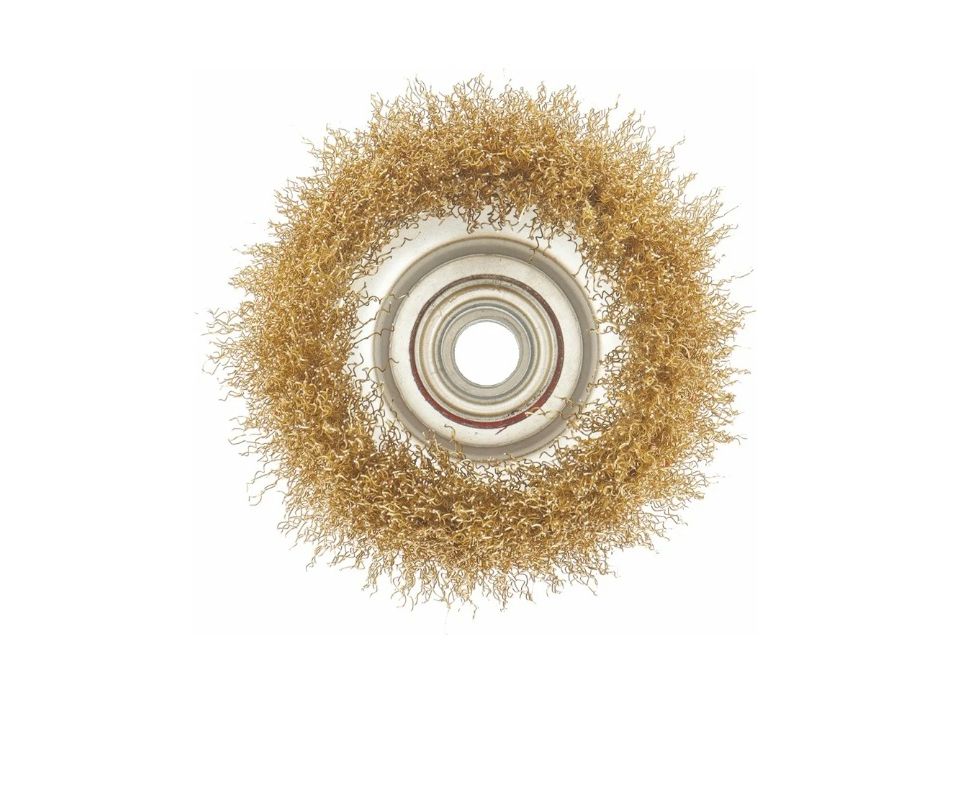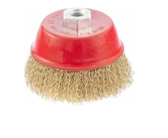 Щетка «чашка» Matrix 74605 диаметром 100 мм, с щетиной из латунированной витой проволоки, устанавливается на вал УШМ с помощью гайки М14. Предназначена для снятия тонкого слоя краски или лака, удаления ржавчины и загрязнений. При рекомендованной скорости вращения 8500 об/мин щеткой можно быстро обрабатывать участки большой площади.