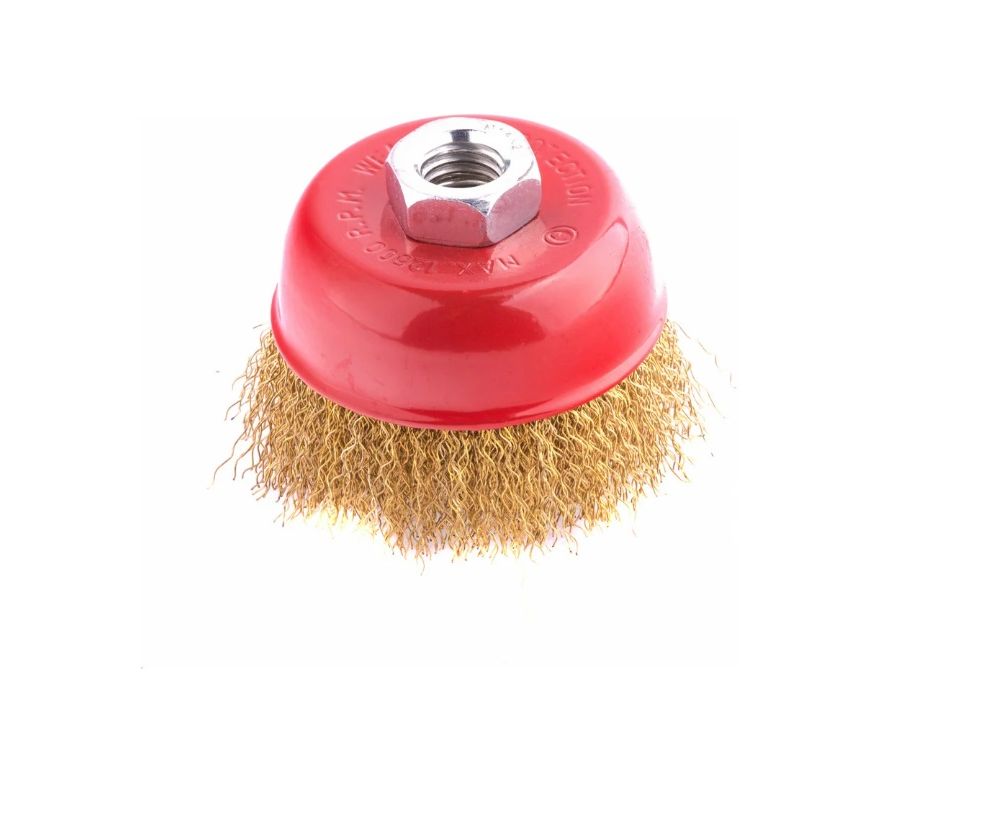Щетка «чашка» Matrix 74604 диаметром 75 мм, с щетиной из латунированной витой проволоки, устанавливается на вал УШМ с помощью гайки М14. Предназначена для снятия тонкого слоя краски или лака, удаления ржавчины и загрязнений. При рекомендованной скорости вращения 12500 об/мин щеткой можно быстро обрабатывать участки большой площади.