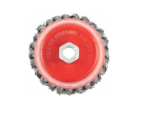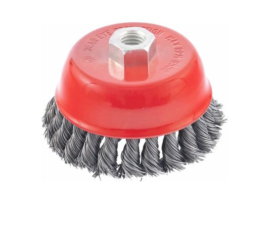 Щетка Matrix «Чашка» 74628 диаметром 100 мм, с присоединительной резьбой М14, с щетиной из крученой проволоки диаметром 0,5 мм, устанавливается на УШМ, поддерживающую работу со скоростью 8500 об/мин. Изделие предназначено для грубой (черновой) обработки поверхностей и подходит для удаления загрязнений, снятия толстого слоя ржавчины, ЛКМ, зачистки сварных швов.