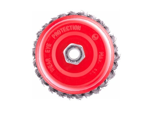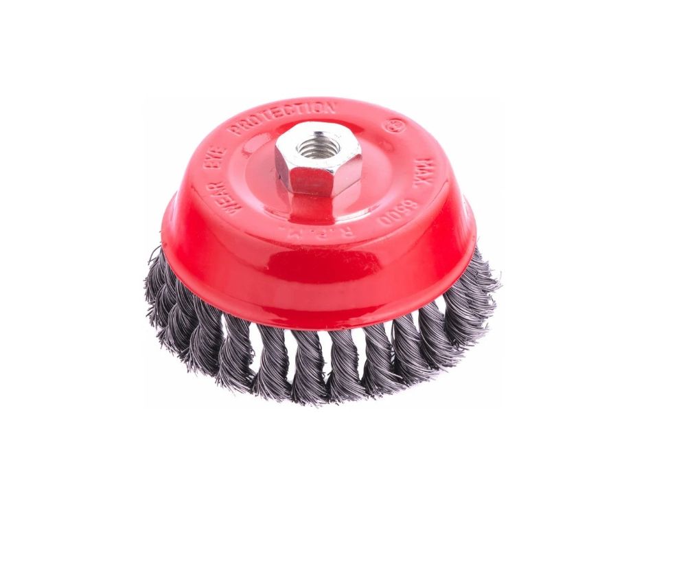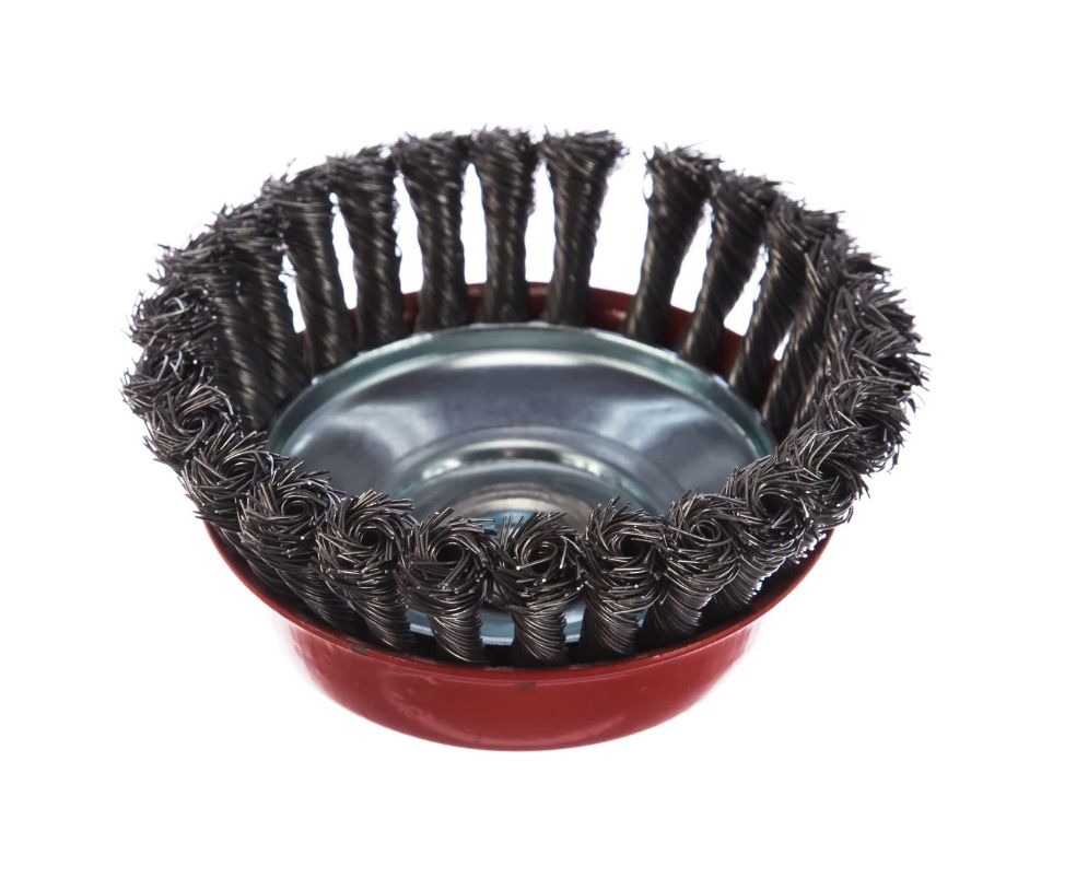 Щетка Matrix «Чашка» 74627 диаметром 125 мм, с присоединительной резьбой М14, с щетиной из крученой проволоки диаметром 0,5 мм, устанавливается на УШМ, поддерживающую работу со скоростью 6500 об/мин. Изделие предназначено для грубой (черновой) обработки поверхностей и подходит для удаления загрязнений, снятия толстого слоя ржавчины, ЛКМ, зачистки сварных швов.