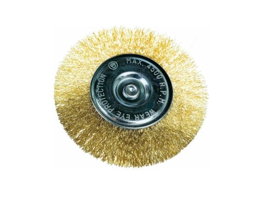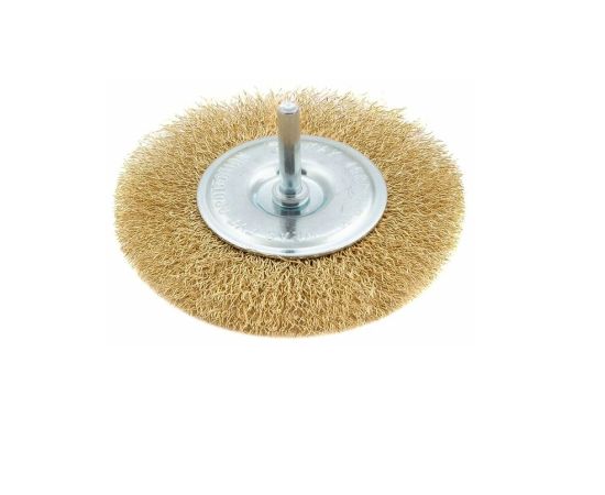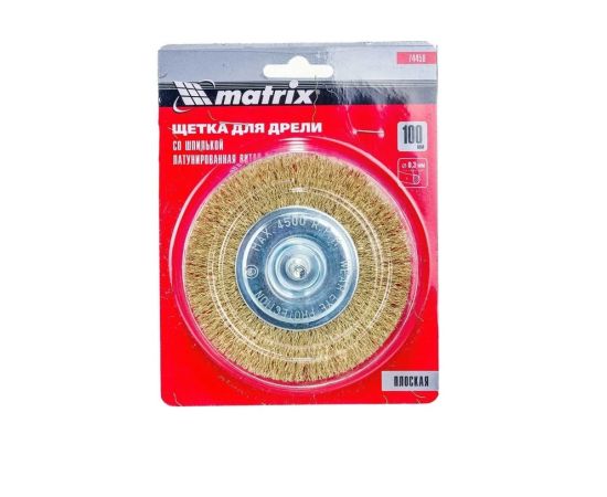 Плоская щётка для дрели Matrix 74450 диаметром 100 мм, со шпилькой, с щетиной из латунированной витой проволоки. Предназначена для бережной очистки металлических, деревянных, пластиковых поверхностей от загрязнений, старых лакокрасочных материалов и ржавчины.
