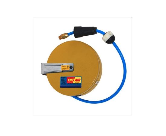 Использование катушки для пневмошланга позволяет избавится от этих неудобств. В этом устройстве шланг в нерабочем состоянии полностью накручен на катушку и не мешает работе. При необходимости он вытягивается на нужную длину, а после работы автоматически наматывается на пневмокатушку.