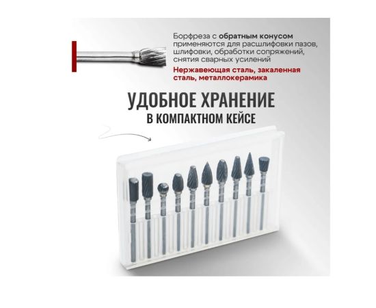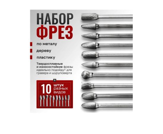 Борфрезы твердосплавные, изготовлены из карбида вольфрама и имеют двойную насечку. Используются для обработки изделий из металла, пластика, оргстекла, дерева, гранита. Набор универсален по размерам шарошек. Насадки подходят для большинства ручных инструментов для дрели, гравера, шуруповерта, и т.д. Применяются для: зачистки сварных швов; обработка краев и заусенцев; проточки шайб и других деталей; обработки металлических профилей сложной формы; обработки труднодоступных мест; зачистки ржавчины; удаление облоя с заготовок; обработки кромок и доводки фигурных отверстий; получений отверстий и углублений в древесине. Набор состоит из 10 фрез различных конфигураций, длинной от 42 до 50 мм, длина рабочей части фрезы от 7 до 13 мм, ширина рабочей части фрезы 6 мм. Фрезы упакованы в пластиковый футляр и не занимают много места. Диаметр хвостика 3 мм.