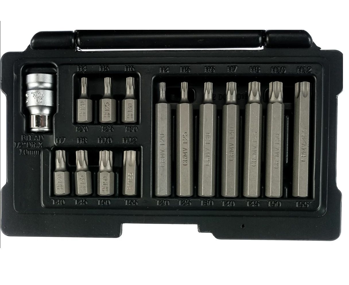 Набор STELS 11315 состоит из шестигранных бит наиболее распространенных размеров, которые используются для работы с крепежными элементами, имеющими профиль TORX. Включает в себя держатель для бит 1/2х10 мм, биты 30 мм - Т20, 25, 30, 40, 45, 50, 55, биты 75 мм - Т20, 25, 30, 40, 45, 50, 55. Насадки изготовлены из хромванадиевой стали, твердость рабочих частей составляет 50-53 HRC. Отличаются высокой прочностью и износостойкостью. Пластиковый кейс обеспечивает удобное хранение принадлежностей.