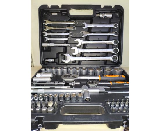1/2", 1/4", CrV, в кейсе, 82 предметов предназначен для ремонта автомобилей, мотоциклов, садовой и другой техники. Подходит как для использования на станциях технического обслуживания, так и в бытовом применении дома или на даче. Инструмент изготовлен в соответствии с международными стандартами. Головки и комбинированные ключи изготовлены из хромованадиевой стали, придающей инструменту высокую твердость и легкость. Биты, биты-вставки и отвёртки производятся из стали S2, улучшающей характеристики крутящего момента и твёрдости. Все наборы упакованы в ударопрочный кейс, изготовленный из жесткого противоударного пластика, с металлическими застёжками. Повышенные показатели прочности, крутящего момента и износостойкости.