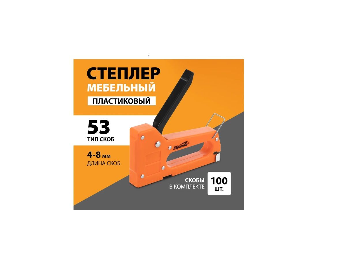 Пластиковый мебельный степлер Sparta 42001 совместим с крепежами типа 53 размером 4-8 мм и поставляется со скобами в количестве 100 шт. Используется для быстрого скрепления с деревянным основанием фанеры, оргалита, ДСП, ДВП, пленки, утеплителя и других листовых материалов. Будет полезен при сборке шкафов, обивке мягкой мебели, при выполнении теплоизоляционных и других крепежных работ.