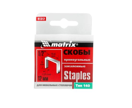 Закаленные скобы Matrix 41312 для мебельного степлера, тип 140, размером 12 х 10,6 х 1,25 мм, 1000 шт. в коробке, помогут обить мебель, зафиксировать утеплитель, а также выполнить другие отделочные и ремонтные работы. Скобы крепко соединяют различные материалы: древесину, фанеру, картон, ДСП.