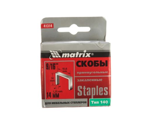 Закаленные скобы Matrix 41314 для мебельного степлера, тип 140, размером 14 х 10,6 х 1,25 мм, 1000 шт. в коробке, помогут обить мебель, зафиксировать утеплитель, а также выполнить другие отделочные и ремонтные работы. Скобы крепко соединяют различные материалы: древесину, фанеру, картон, ДСП.