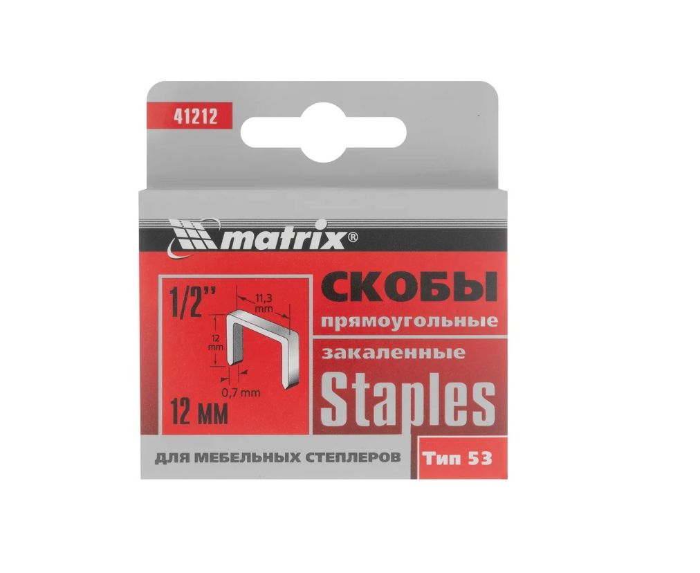 Закаленные скобы Matrix 41212 для мебельного степлера, тип 53, размером 12 х 11,3 х 0,7 мм, 1000 шт. в коробке, помогут обить мебель, зафиксировать утеплитель, а также выполнить другие отделочные и ремонтные работы. Скобы крепко соединяют различные материалы: древесину, фанеру, картон, ДСП.