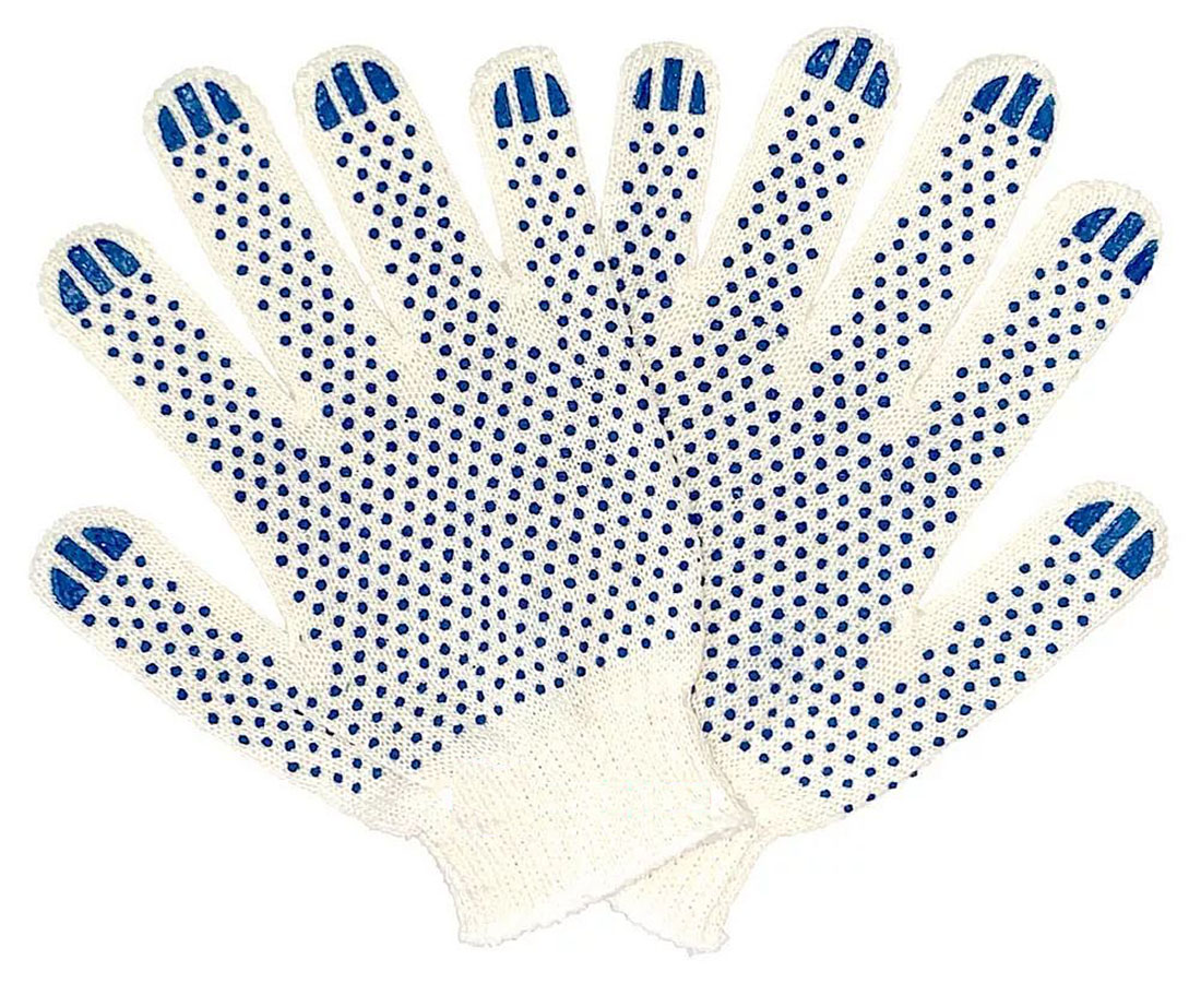 Трикотажные перчатки из х/б нитей, усиленные ПВХ напылением являются надежным средством защиты рук от различных внешних воздействий. 10 класс вязки и пряжа в 5 нитей обеспечивают им высокую прочность, малый вес и небольшую толщину, отсутствие швов гарантирует свободу движений при любых манипуляциях, натуральный материал отлично отводит влагу и пропускает воздух, а ПВХ напыление снижает почти до нуля скольжение перчаток по гладким поверхностям. Изделие является гигиеничным и гипоаллергенным, может использоваться как самостоятельно, так и в качестве базовых перчаток под краги или рукавицы.