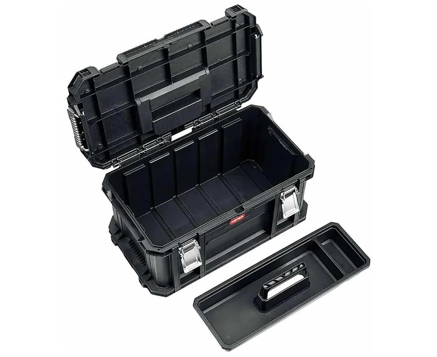 Прочная система транспортировки GEAR с вместительными модулями предлагает разные варианты компоновки элементов. Металлические ручки не только позволяют переносить ящики, но и надежно фиксируют их друг с другом.