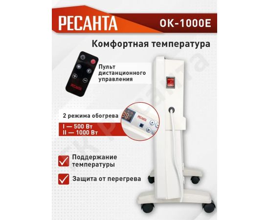 Конвектор Ресанта ОК-1000Е - обогреватель с электронной панелью управления и LED-дисплеем для тех, кто заботится о качестве воздуха в доме. Монолитный нагревательный элемент не сушит воздух и не сжигает кислород. Благодаря классу защиты IP24 электроконвектор можно включать во влажных помещениях.