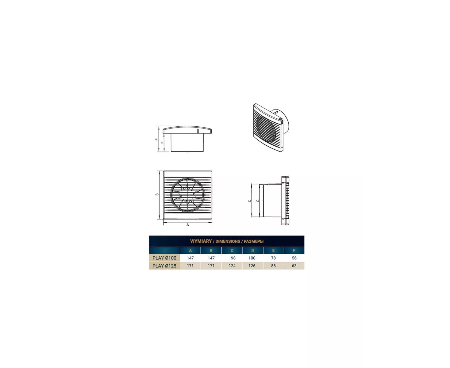 Dospel PLAY Satin 100 WCH – бытовой накладной вытяжной вентилятор. С его помощью осуществляется отвод отработанного воздуха. Вентилятор серии PLAY Satin представляет собой заключенный в корпус двигатель, на оси которого расположено рабочее колесо с лопатками. Лицевая сторона вентилятора обеспечивает его монтаж к ровной поверхности, а остальная часть вентилятора погружается в вентиляционный канал.Вентиляторы Dospel PLAY Satin 100 WCH используются для периодической и постоянной вытяжной вентиляции в жилых, офисных, торговых и подсобных помещениях, в лечебных и детских учреждениях, для санузлов, душевых, кухонь, гаражей и других бытовых помещений.Он обладает компактной формой и отличается классическим дизайном. К преимуществам бытового вентилятора относятся малые габариты, низкий уровень шума, низкое энергопотребление, демократичная цена, долговечность, качество и надежность. Лицевая панель вентилятора легко снимается, что удобно для обслуживания вентилятора.