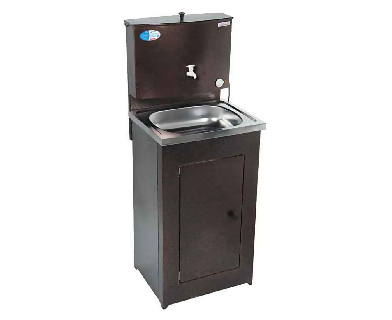 Умывальник изготовлен из высококачественной стали 0,7 мм, окрашен стойкой краской медного цвета. Конструкция умывальника сборная, состоит из бака со специальным пластиковым краном для экономии воды и тумбы, которая незаметно скрывает способ отлива воды и позволяет монтировать отвод воды как в закрытую емкость, так и в канализацию. Бак изнутри обработан гальваническим цинковым покрытием, которое гарантирует долговечность продукции и исключает возникновение ржавчины.
