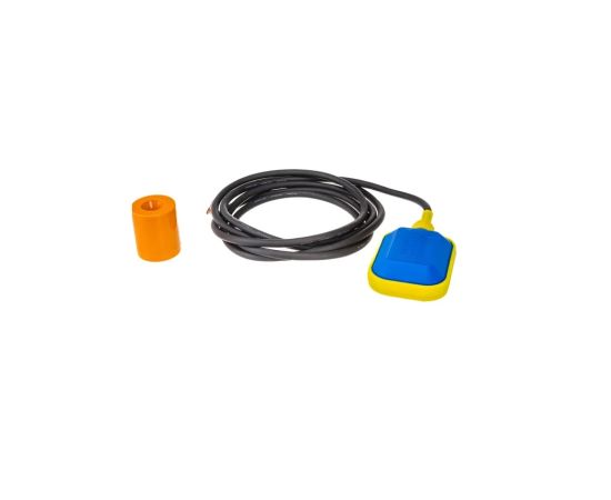 Выключатель поплавковый состоит из пластикового корпуса с электрическим переключателем, представляющим из себя рычаг, переключающий контакты в положение включено/выключено. Если происходит смена положения поплавка, металлический грузик внутри выключателя меняет позицию этого рычага. Трехжильный кабель, соединенный с переключателем, получает сигнал после соединения разного вида контактов, включающий или выключающий насос.