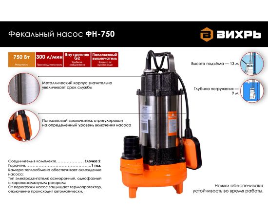 Фекальный насос ВИХРЬ ФН-750 - является идеальным решением для применения на дачном участке для откачки загрязненных сточных и бытовых вод. Электродвигатель состоит из статора, который оснащен двумя обмотками с термопротектором, который защищает от перегрева при превышении температуры обмоток выше допустимой нормы. Устройство относится к погружным насосам, особенностью которых является то, что механизм находится ниже уровня выкачиваемой жидкости (воды или стоков). Специальный поплавковый механизм позволяет насосу включаться в момент, когда уровень жидкости достигает критичного уровня (поднимается или опускается до определённой точки).