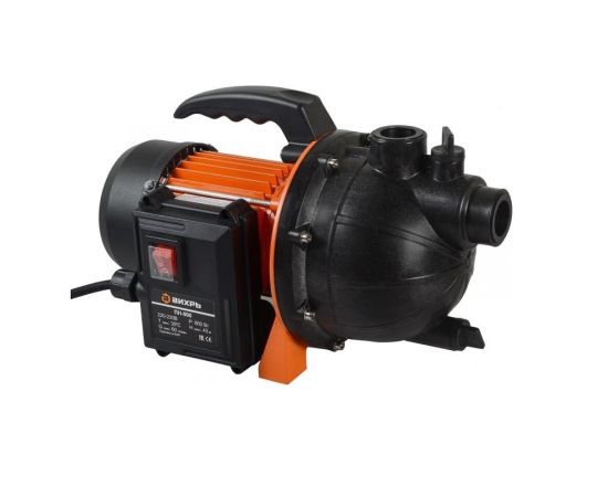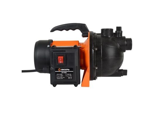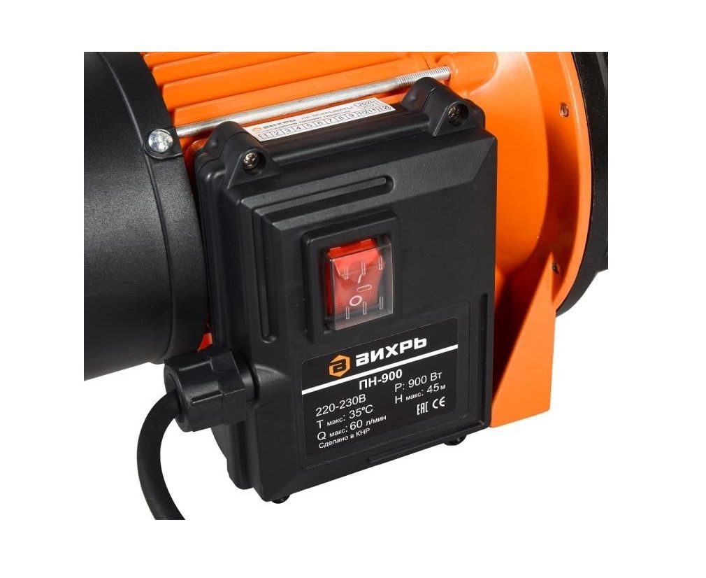 Поверхностный насос Вихрь ПН-900 будет полезен при необходимости подачи чистой воды под давлением в загородный дом, на садовый участок, небольшую ферму. Конструкция состоит из центробежного насоса и электродвигателя мощностью 900 Вт, заключенных в прочный пластиковый корпус. Производительность составляет 60 л/мин. Для удобства переноски модель имеет рукоятку. Насосная часть сделана из пластика, но патрубки на ее крышке усилены металлической резьбой, диаметры входного и выходного отверстий составляют 1 дюйм. Крыльчатка насоса изготовлена из композитного пластика и рассчитана на работу с относительно чистой водой, в которой допускаются небольшие примеси твердых частиц (до 150 г/м³). Наличие волокон, абразивных включений, химических веществ в перекачиваемой жидкости недопустимо. Поверхностный насос имеет функцию самовсасывания. Максимальная глубина, с которой он может производить забор воды, составляет 9 м. Мощности двигателя достаточно для подъема воды на высоту до 45 м, что позволяет использовать агрегат для к