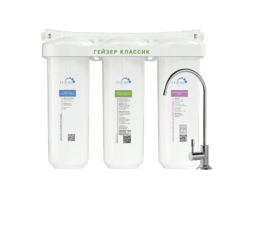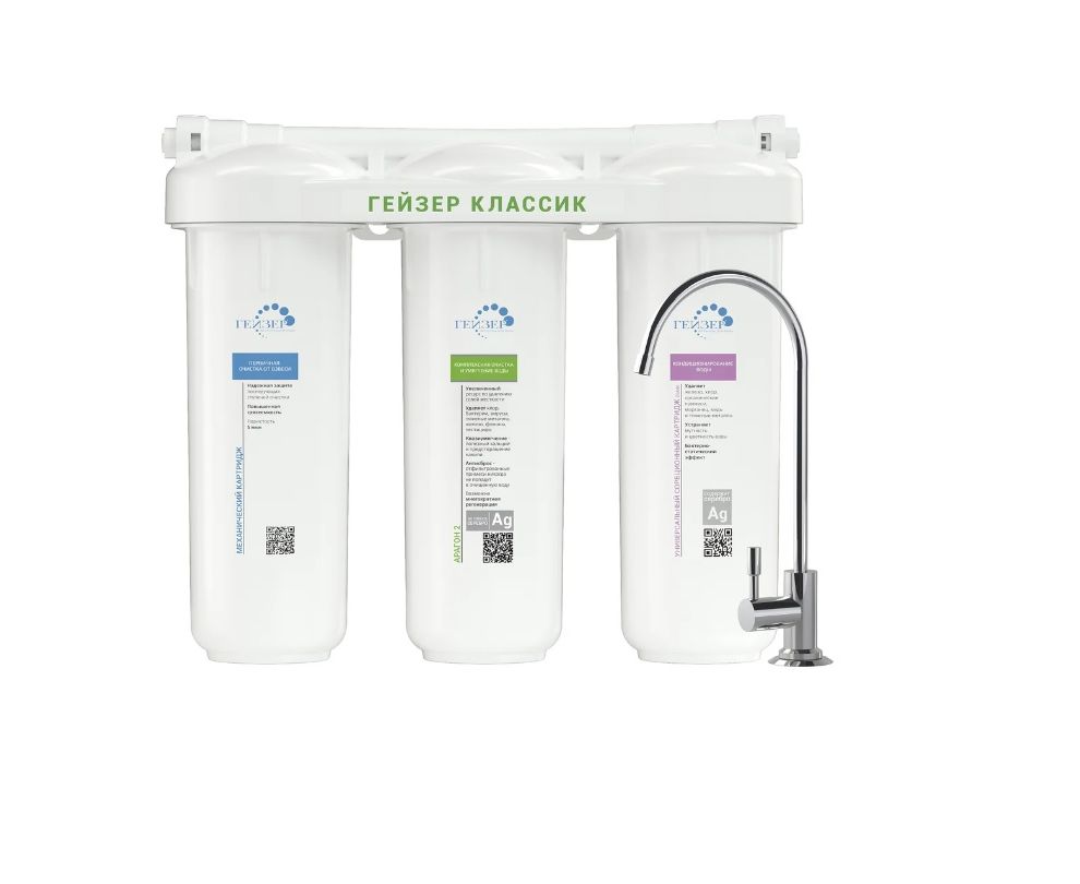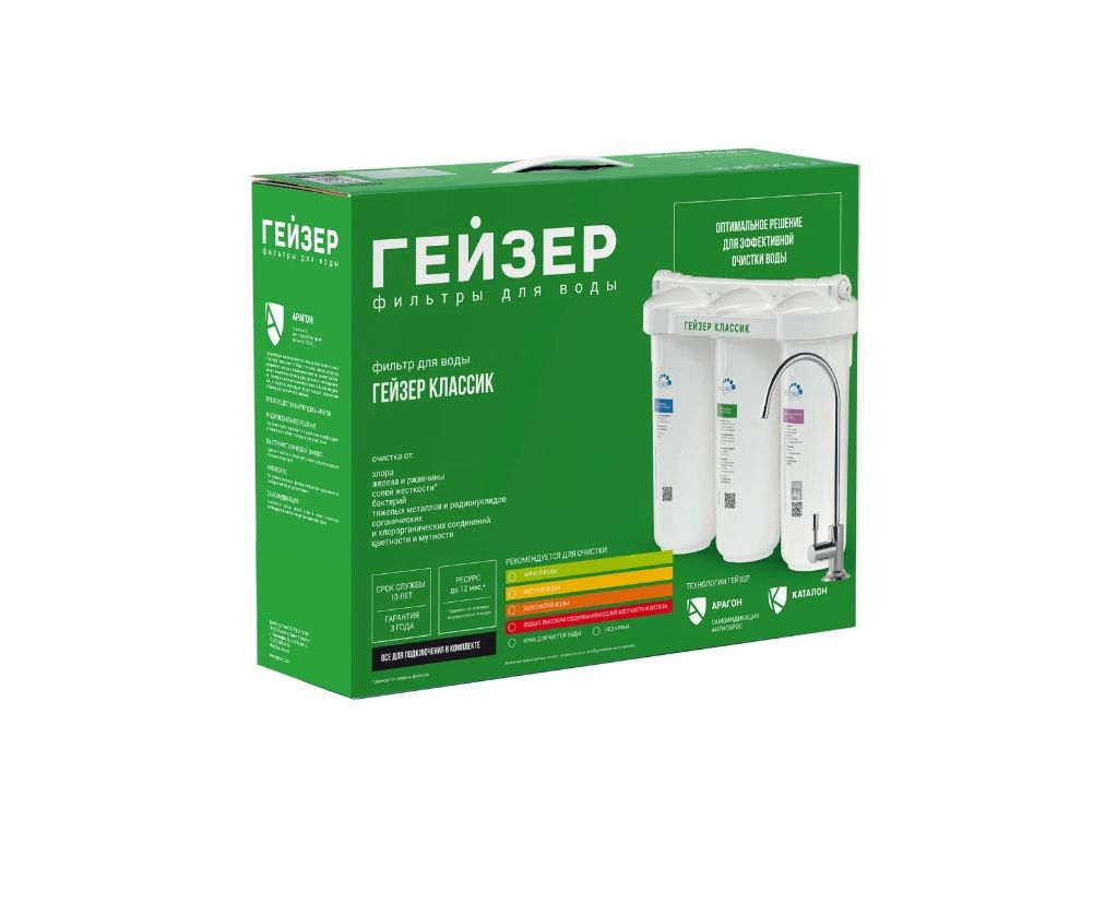 Фильтр для воды Гейзер Классик Ж 11044 имеет три ступени и обеспечивает очищение воды от тяжелых металлов, железа марганца, солей жесткости, хлора и органических примесей. Картридж БАФ имеет ресурс до 10000 литров. Картридж Арагон имеет индикацию ресурса - по мере засорения поток воды падает. Картридж можно многократно регенерировать. Температура очищаемой воды не должна превышать 40 градусов.