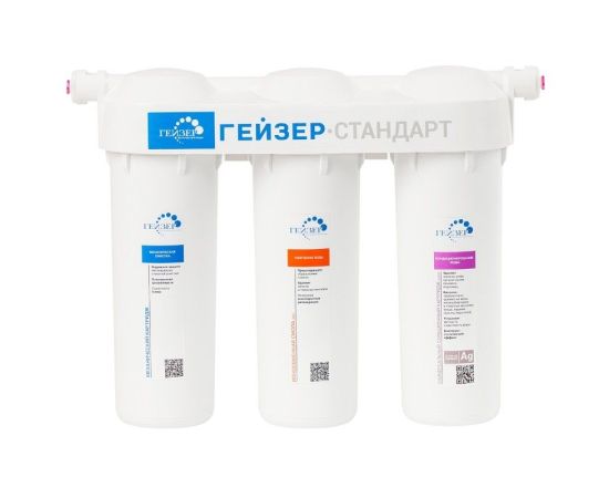Фильтр для воды Гейзер Стандарт Ж 19064 предназначен для очистки жесткой водопроводной воды. Фильтр способен удалить из воды излишки взвешенных частиц, мутности, цветности, хлора, тяжелых металлов, органических соединений, солей жесткости и др. примесей. Фильтр включает в себя: полипропиленовый модуль PP, 10"SLIM - для удаления нерастворимых частиц (песок, взвесь, ржавчина); картридж БС, благодаря которому из воды убираются избыточные соли жесткости ионообменной смолой пищевого класса; сорбционный картридж (БАФ) - на данной стадии удаляется не только хлор и органические примеси, но и снижает содержание железа и тяжелых металлов.