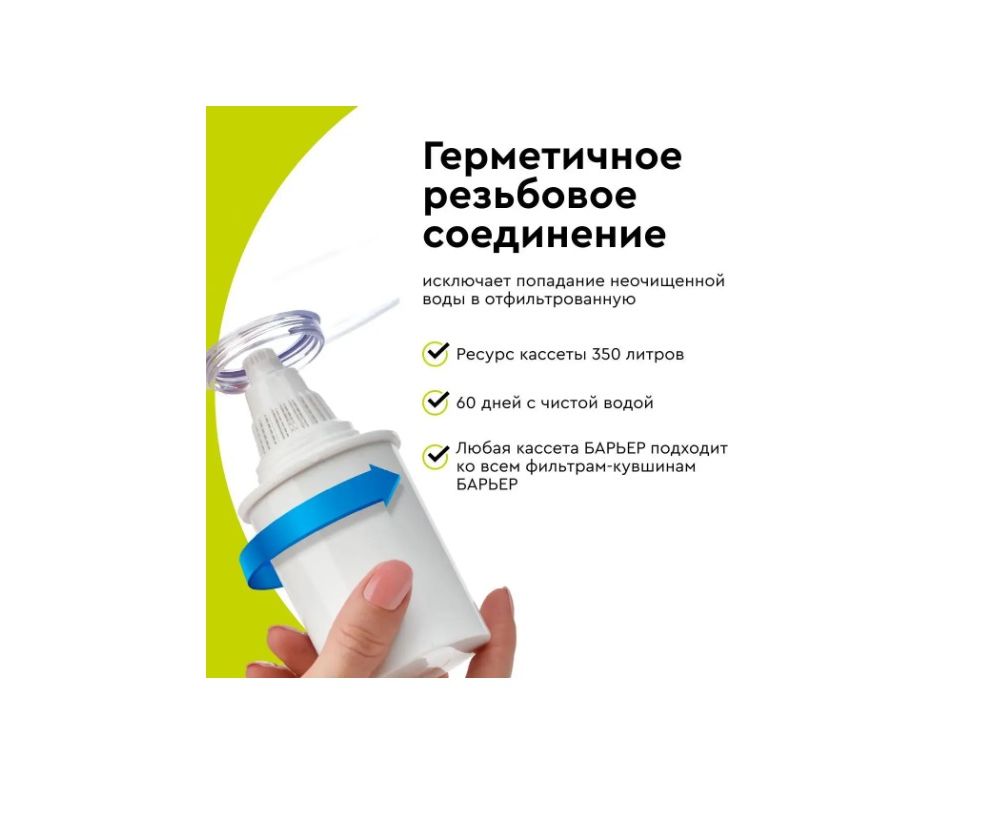 С фильтрами БАРЬЕР вам не придется запоминать размер или диаметр сменной кассеты: любая кассета БАРЬЕР подходит ко всем фильтрам-кувшинам БАРЬЕР. А герметичное резьбовое соединение исключает попадание неочищенной воды в отфильтрованную.
