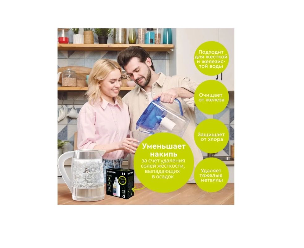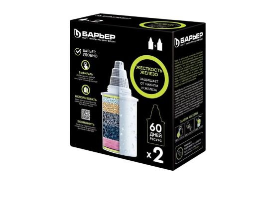 Комплект из 2 сменных кассет для фильтра БАРЬЕР Жесткость Железо. Снижает жесткость, которую мы привыкли встречать в жизни в виде накипи, удаляет из воды растворенное железо и неприятный металлический привкус, а также, как и все кассеты БАРЬЕР, очищает от хлора, тяжелых металлов и других вредных примесей. Результат – чистая вода без накипи, рыжеватого осадка и неприятного привкуса. Ресурс каждой кассеты — 350 литров.