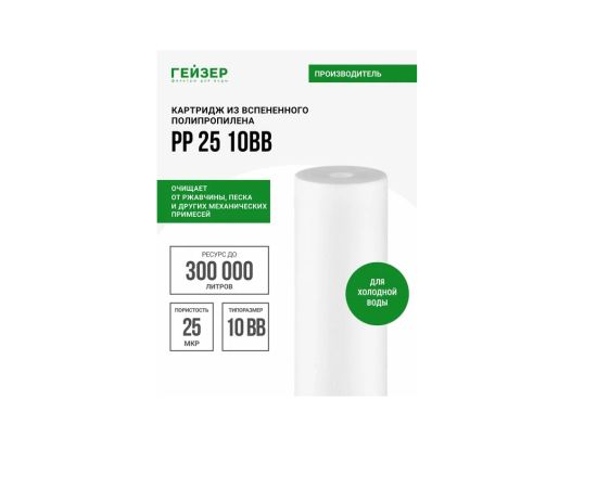 Картридж Гейзер PP 25-10 BB 28208 предназначен для механической очистки воды от нерастворимых примесей, в том числе от ржавчины, грязи, песка.