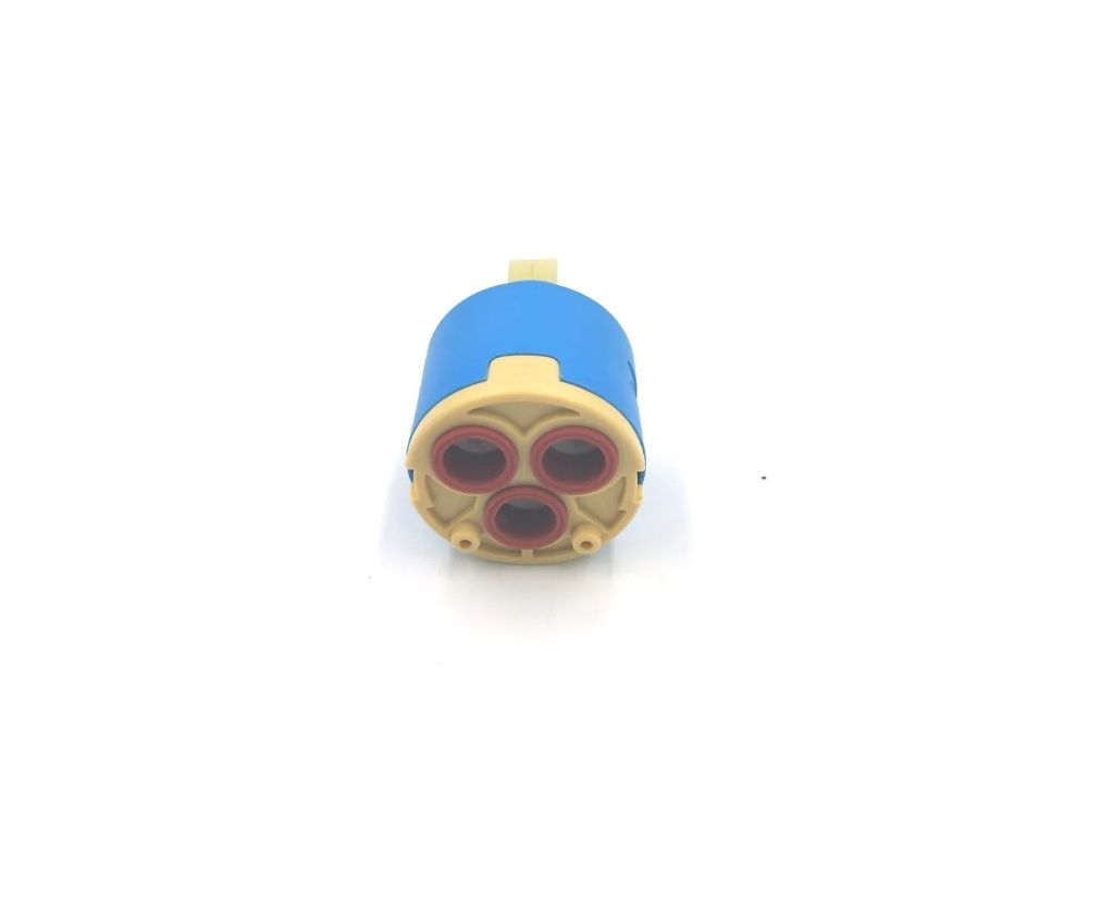Картридж для смесителя выполняет функцию смешивания и регулировки потока горячей и холодной воды. В керамическом картридже для смесителя используются плотно притертые между собой пластины из металлокерамики. Благодаря этому керамический картридж служит долго и позволяет осуществлять точную регулировку напора и температуры воды, подаваемой из смесителя. Корпус и рычаг управления картриджа для смесителя изготовлены из прочного пластика. Рычаг (шток) опускается в сторону к ножкам. Внутри картриджа есть сеточка для шумоподавления.