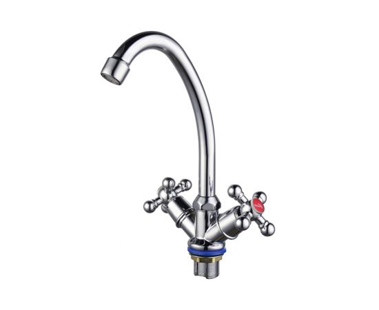 Двухвентильный смеситель для раковины выполнен из сплава цветных металлов. Форма излива крана - округлая, изогнутая. Предназначен для подачи и смешивания холодной и горячей воды, поступающей из централизованных или местных систем холодного и горячего водоснабжения.