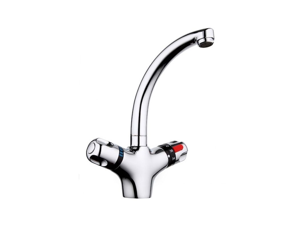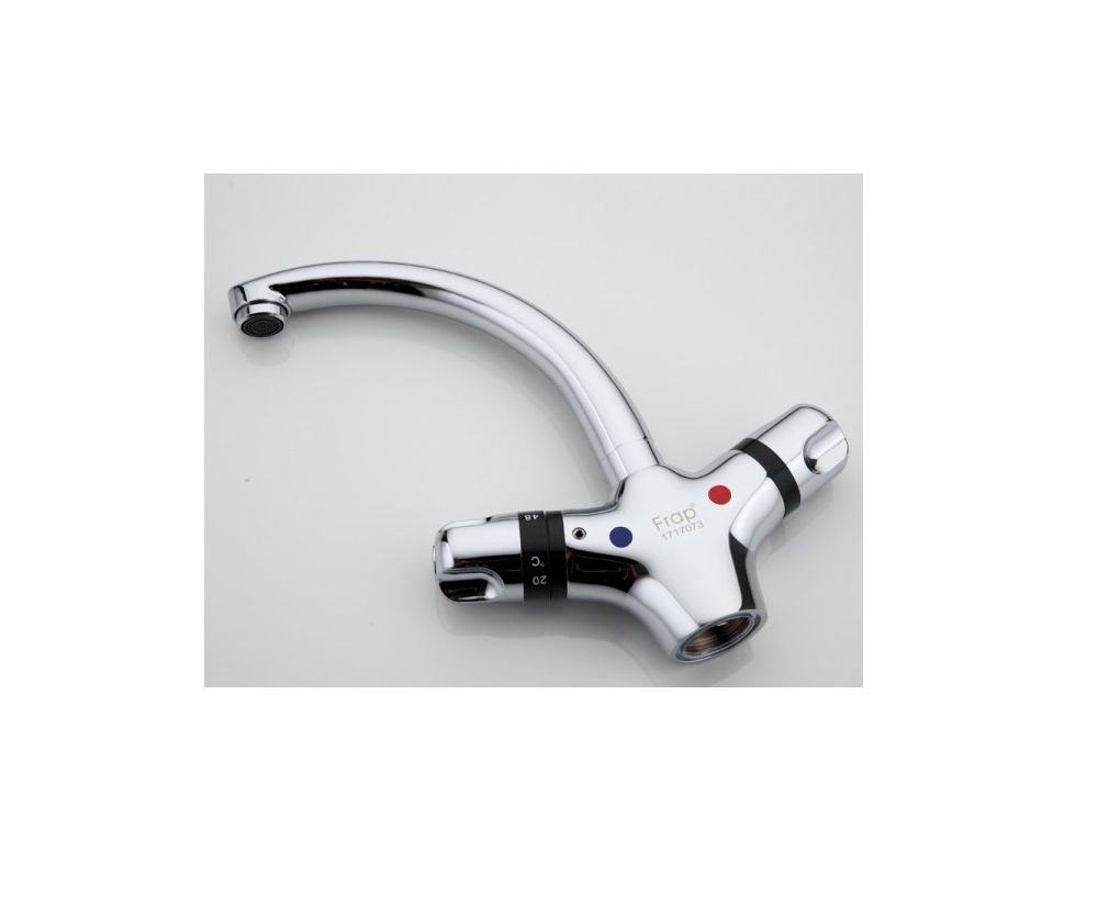Смеситель для раковины с термостатом Frap F1051 является той новинкой, которая только начинает пользоваться спросом среди потребителей. Благодаря барашковым ручкам с термостатом, каждый, кто будет пользоваться данным смесителем, сможет не только отрегулировать фиксированную температуру горячей воды, но еще и силу напора воды. Смеситель с термостатом данной серии имеет запорный клапан (кран-букса керамика) и аэратор, изготавливается из латуни и снаружи покрыт хромом. Формы излива выполнены в традиционном стиле, но само изделие выглядит довольно таки современно и впишется в любой интерьер.