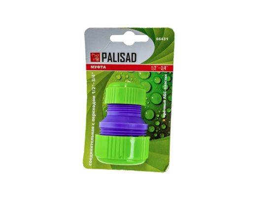 Муфта соединительная с переходом 1/2–3/4 дюйма пластмассовая Palisad 66431 предназначена для соединения двух поливочных шлангов разных диаметров с целью наращивания длины.