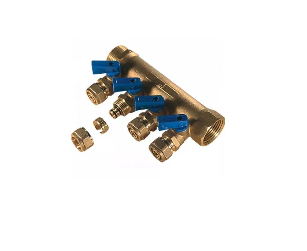 Коллектор с кранами и цангами — это сантехнический коллектор, который включает шаровые краны на каждый отвод и цанги под металлопластиковую трубу диаметром 16 мм.