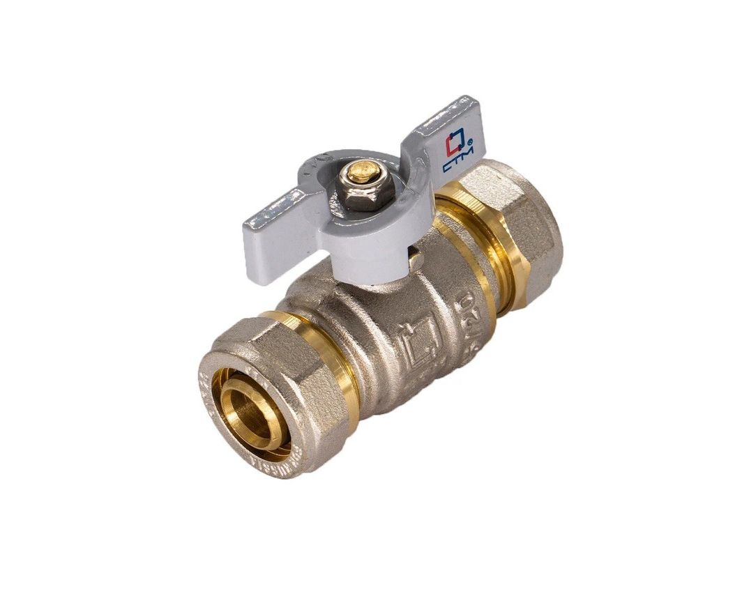 Кран шаровой для воды 16х20 CTM СТАНДАРТ с цангой (обжимными соединениями) и ручкой-бабочкой (артикул CWPB1620) — запорная арматура, которая применяется в системах питьевого, хозяйственно-бытового и промышленного назначения, холодного и горячего водоснабжения, отопления.