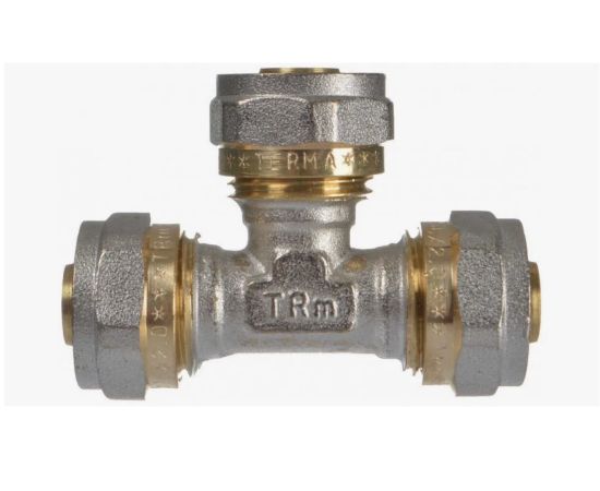 Тройник TeRma 01400 цанга/цанга/цанга размером 16×16×16 мм (артикул 35503) — латунный никелированный фитинг для создания разъёмных соединений в системах металлопластиковых трубопроводов.