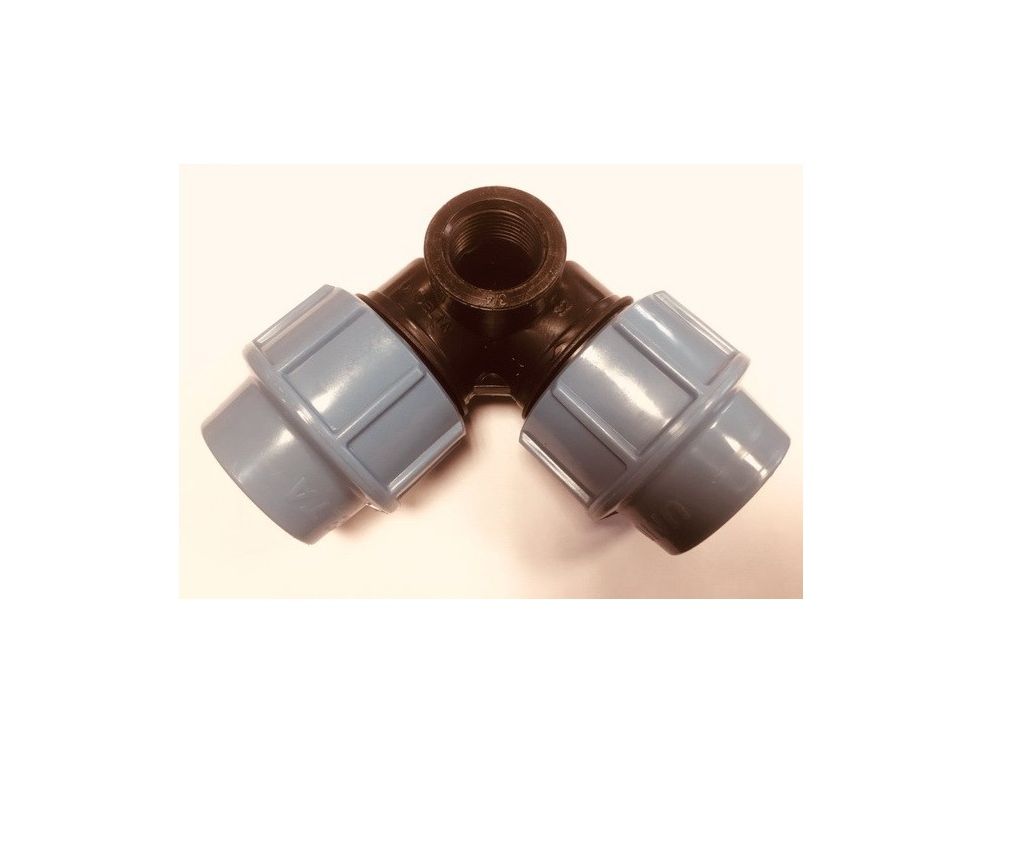 Служит для соединения двух полиэтиленовых труб диаметром 32 мм под углом 90° с возможностью подключения шарового крана диаметром 3/4" с боку фитинга.