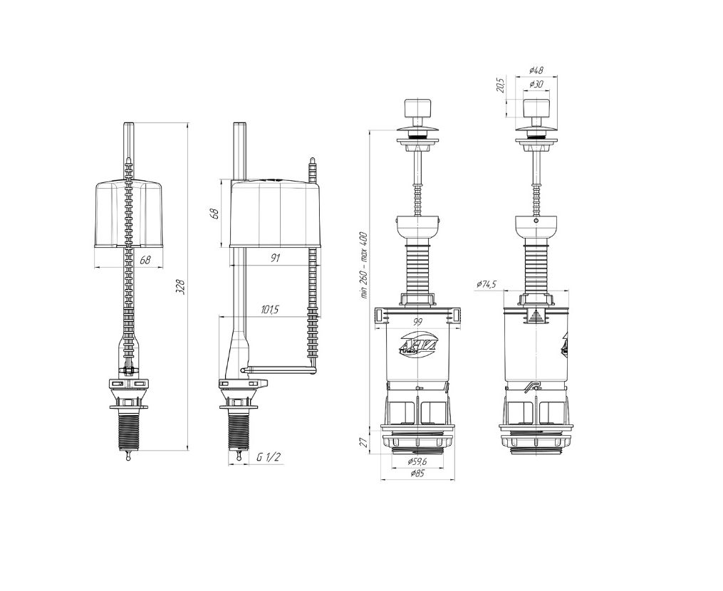 Сливной механизм белая ручка со штоковым режимом слива, регулировка по высоте 260-400 мм. Отверстие под ручку слива в крышке бачка от 25 до 40 мм, посадочное отверстие сливной арматуры 60 мм.