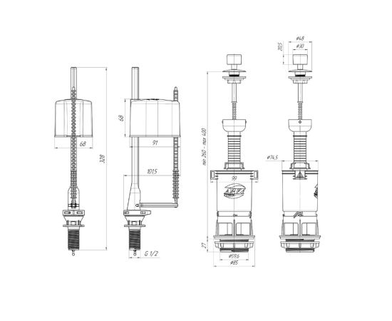 Сливной механизм металлизированная ручка со штоковым режимом слива, регулировка по высоте 260-400 мм. Отверстие под ручку слива в крышке бачка от 25 до 40 мм, посадочное отверстие сливной арматуры 60 мм.