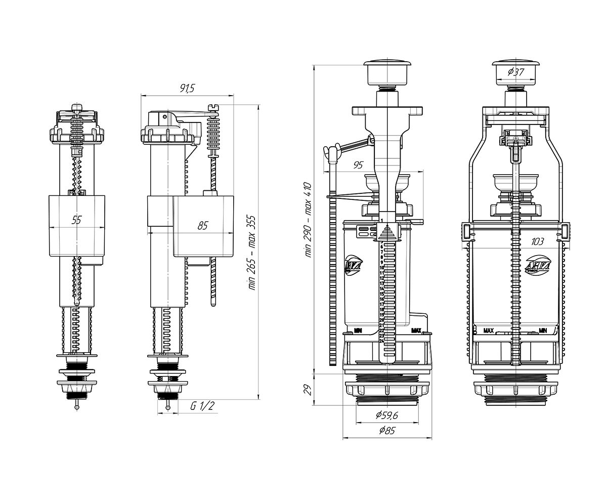 Набор для бачка унитаза АНИ пласт WC8510C. Наливной механизм с нижней подводкой и пластиковой резьбой диаметром 1/2", регулировка по высоте 265-355 мм (стойка механизма поворачивается, устанавливается нужная высота, после чего поворачивается обратно).