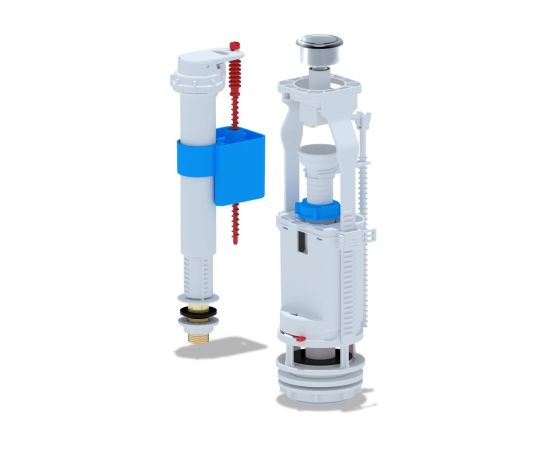 Набор для бачка унитаза. Наливной механизм с нижней подводкой и латунной резьбой G 1/2. Сливной механизм хромированная кнопка с одним режимом слива